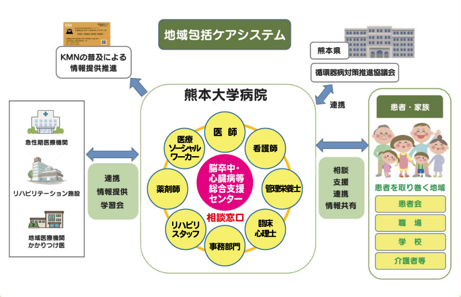 こうした患者様やご家族の様々な疑問や悩みを伺って一緒に解決すること、そのために他の病院や熊本県との連携を強化していくことを目的として、国の事業により、『循環器病』を幅広く支援する「脳卒中・心臓病等総合支援センター」を熊本大学病院内に開設する運びとなりました。