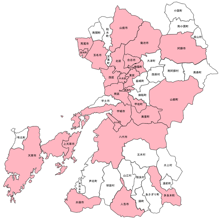 現在、熊本県内61の医療機関(ピンクに着色された市区町村)に脳卒中・心臓病相談支援窓口があります。