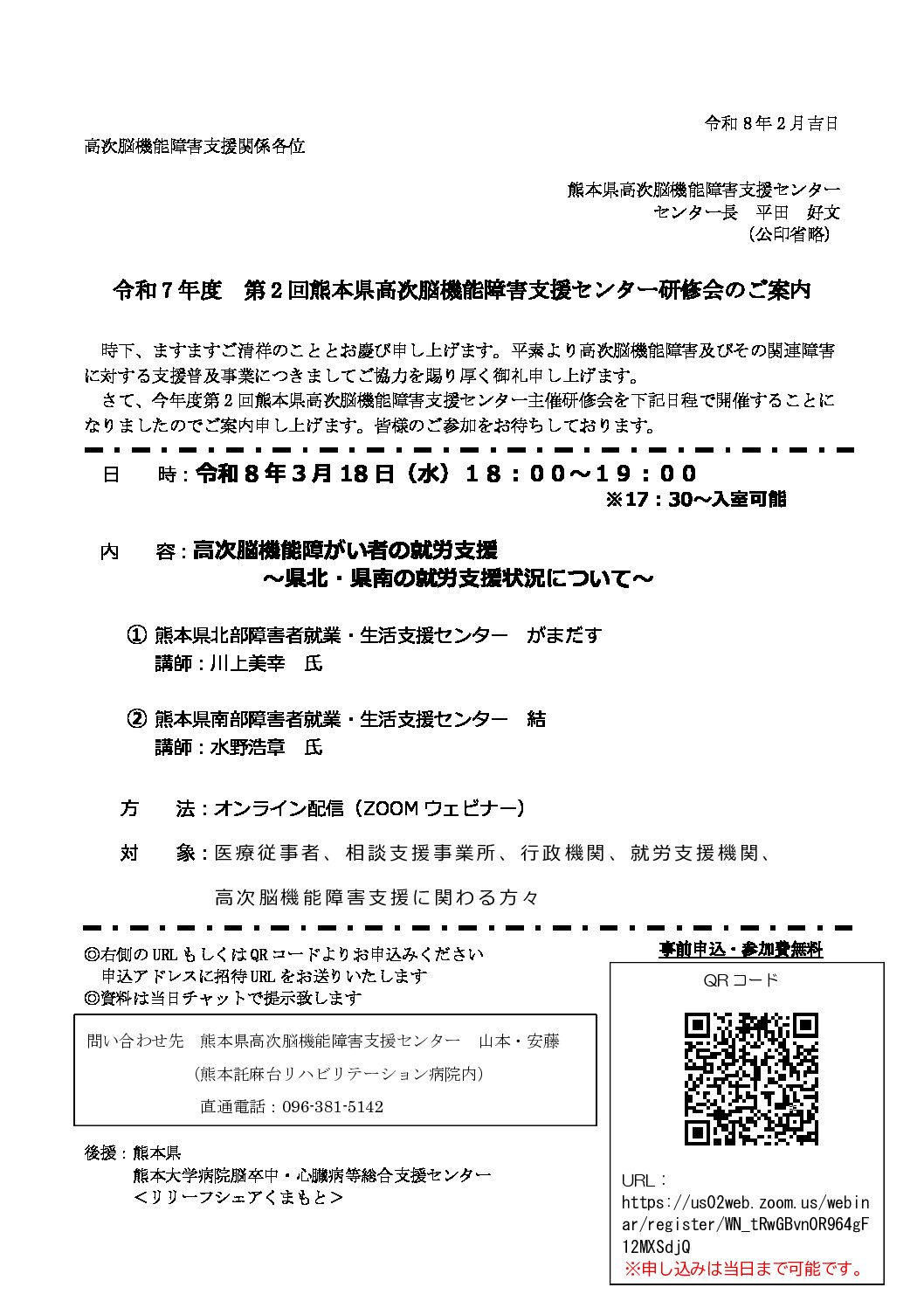 令和 7 年度 第 2 回 熊本県高次脳機能障害支援センター研修会のご案内 【開催日】令和8年3月18日(水)